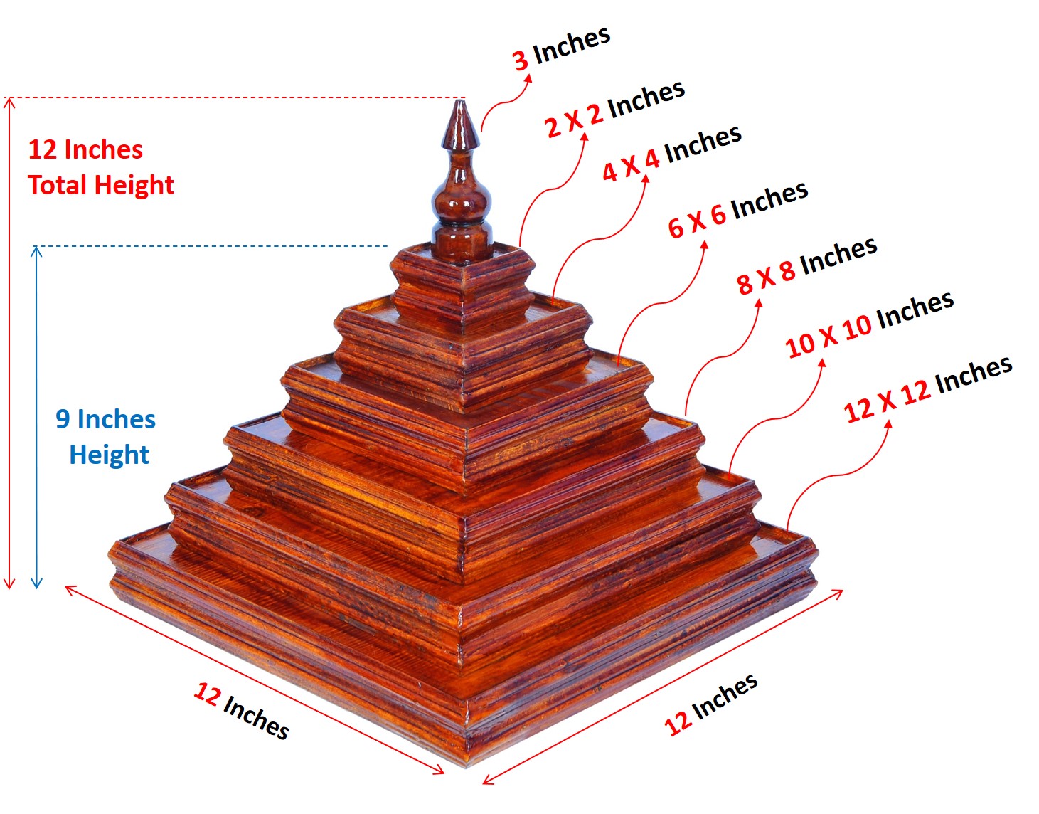 Dome(Gopur) for the wooden Mandap.It has 6 steps as shown in the image. Bottom to top, steps sizes in Inches are 12 X 12, 10 X 10, 8 X 8 and 6 X 6, 4 X 4, 2 X 2.