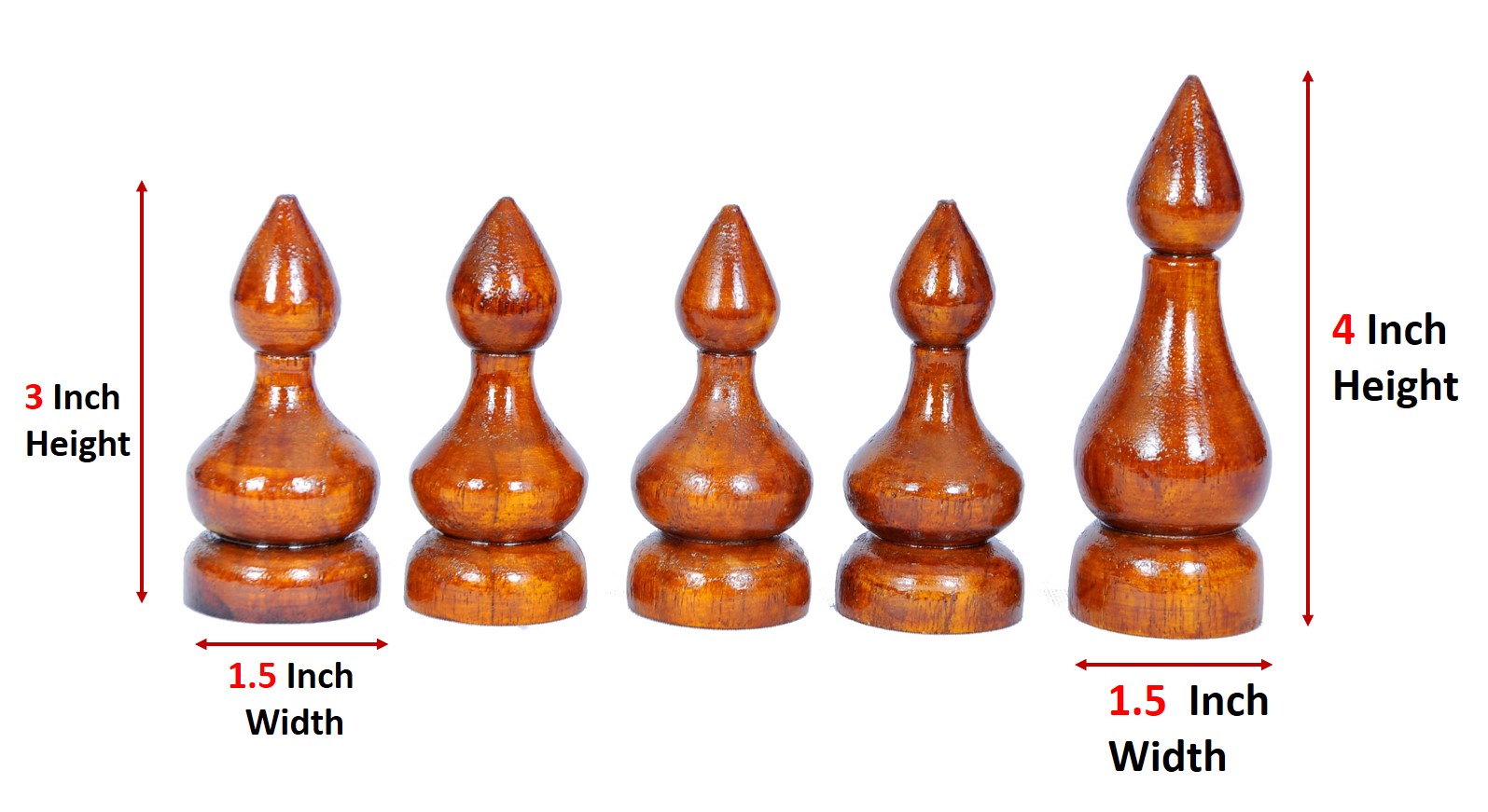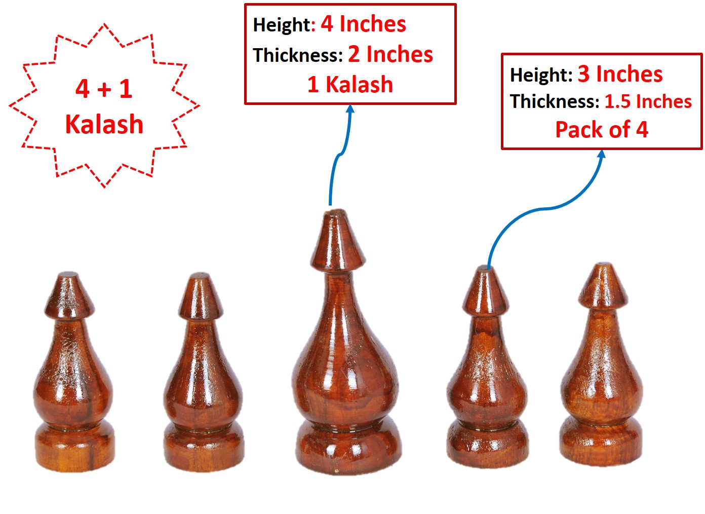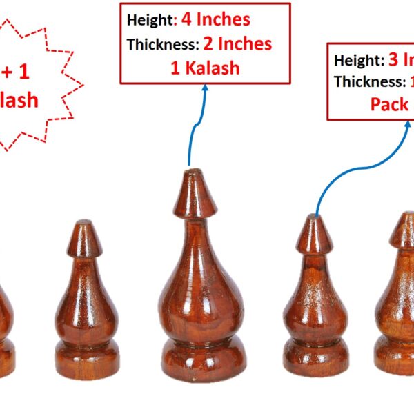 4 Smaller kalash of Height 3 Inches and thickness 1.5 Inches and 1 Big kalash of Height 4 Inches and thickness 2 Inches.